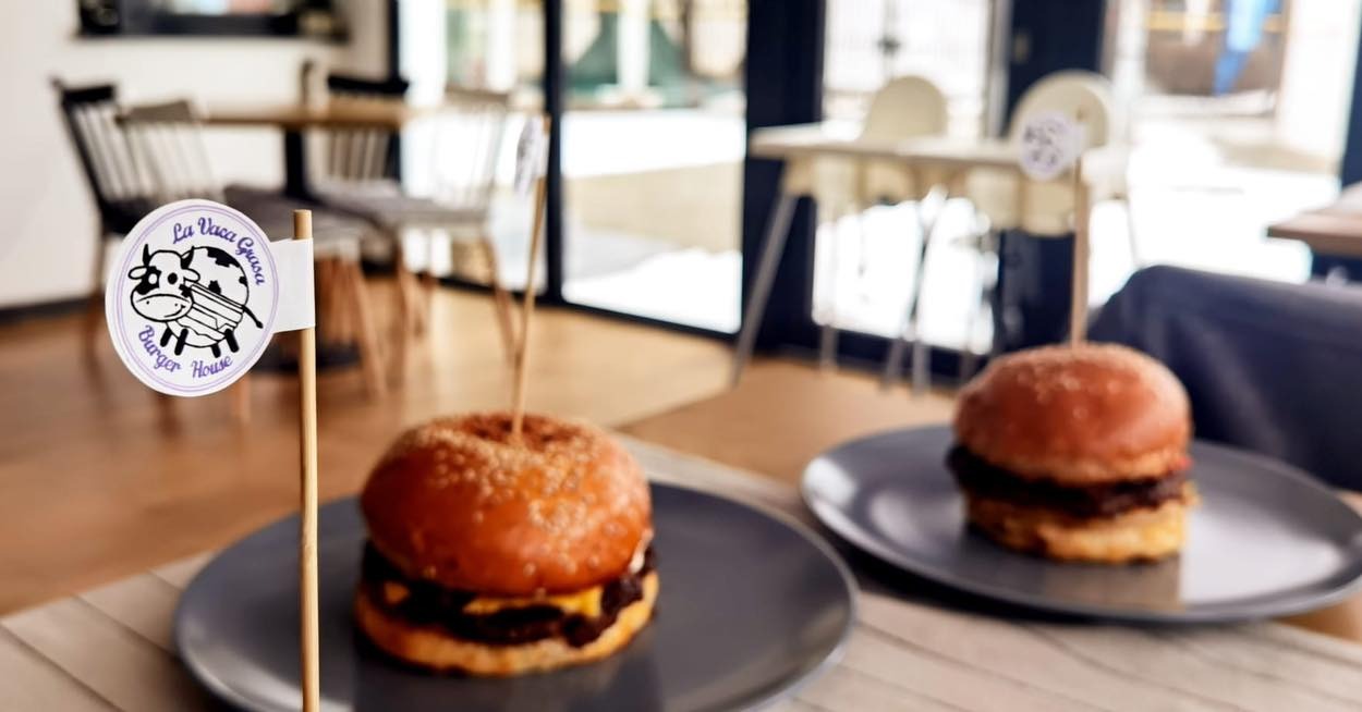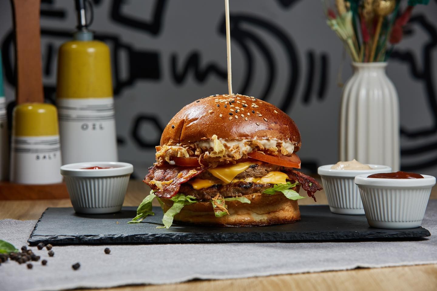 chiflă proaspătă, carne de vită, brânză topită cu cheddar, bacon, salată iceberg, roșie, cremă de brânză, sosul casei (barbeque)