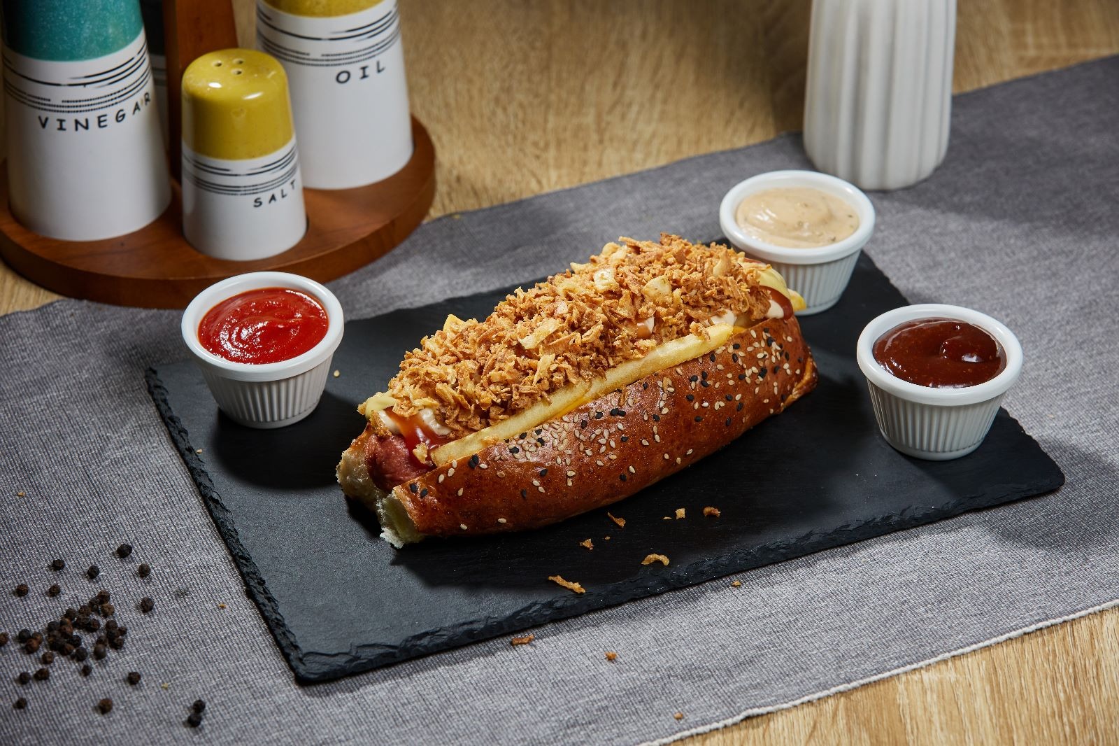 chiflă proaspătă, cremvuști, ceapă crocantă, brânză topită cu cheddar, sosul casei (maioneză cu usturoi), ketchup, muștar, cartofi