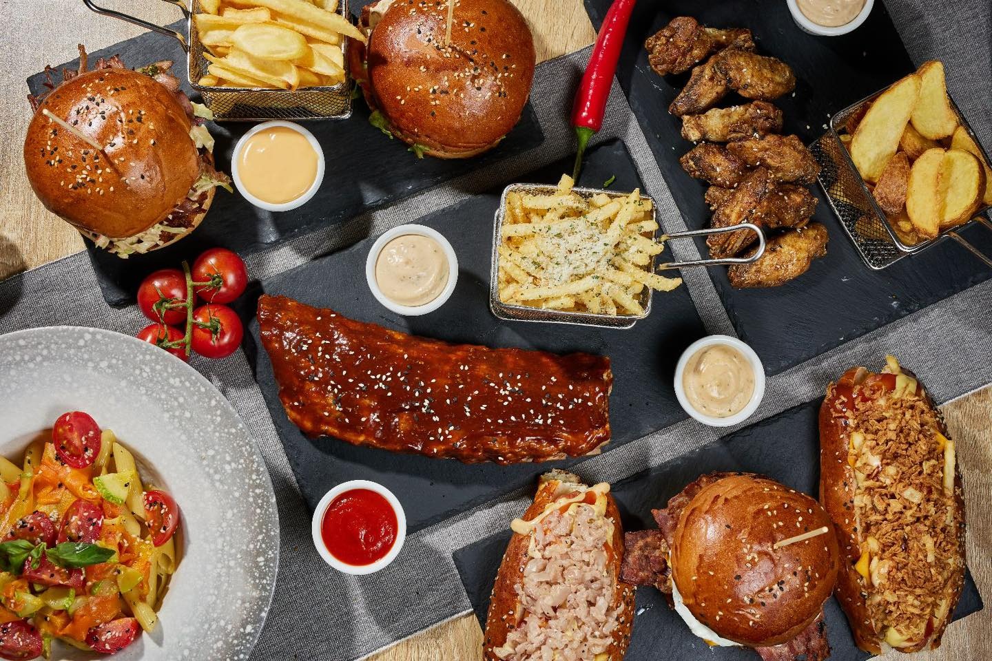 chiflă proaspătă, carne de vită, brânză topită cu cheddar, bacon, salată iceberg, ardei copt, sosul casei (maioneză cu usturoi), brânză în stil grecesc